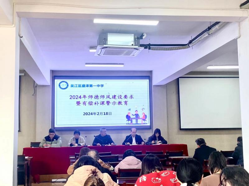 万象更新,春暖花开,在隐隐的鞭炮中我们迎来了新学期!为夯实教师队伍专业素质,规范教师职业道德行为、明确师德底线,弘扬教师立德树人、爱岗敬业、为人师表的高尚师德,盛泽一中于2024年2月18日在三楼大会议室召开了“2024年师德师风建设要求暨有偿补课警示教育大会”。会议由朱伟副校长主持,全体教师出席并参加。